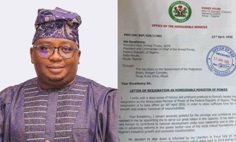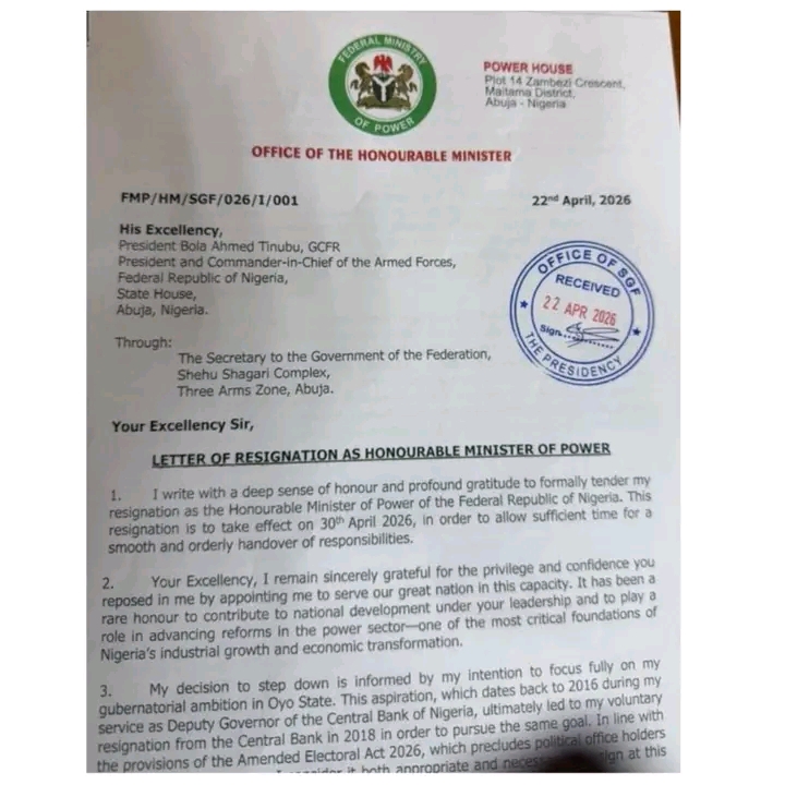He wrote, “I write with a deep sense of honour and profound gratitude to formally tender my resignation as the Honourable Minister of Power of the Federal Republic of Nigeria. This resignation is to take effect on 30th April 2026, in order to allow sufficient time for a smooth and orderly handover of responsibilities.”