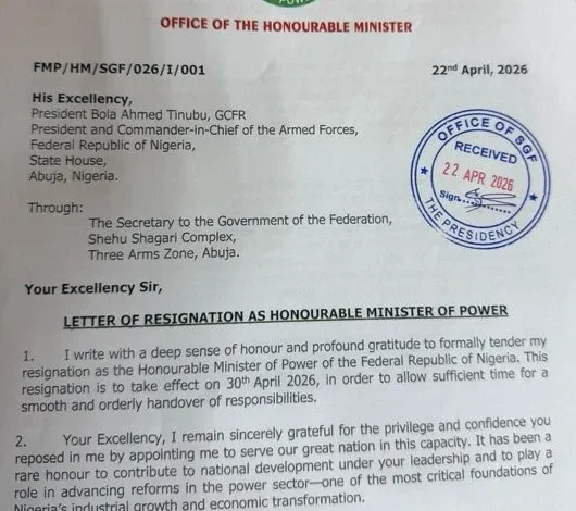 “I write with a deep sense of honour and profound gratitude to formally tender my resignation as the Honourable Minister of Power of the Federal Republic of Nigeria,” the letter reads.