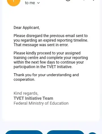 “Please ignore the previous email sent to you about an expired reporting timeline. That message was sent in error,” the notice reads. “Kindly go to your assigned training centre and complete your reporting within the next few days to continue in the TVET Initiative.”