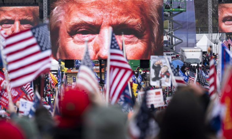 An image of President Trump appears on video screens before his speech to supporters from the Ellipse at the White House on Jan. 6, 2021, as Congress prepares to certify the electoral college votes.