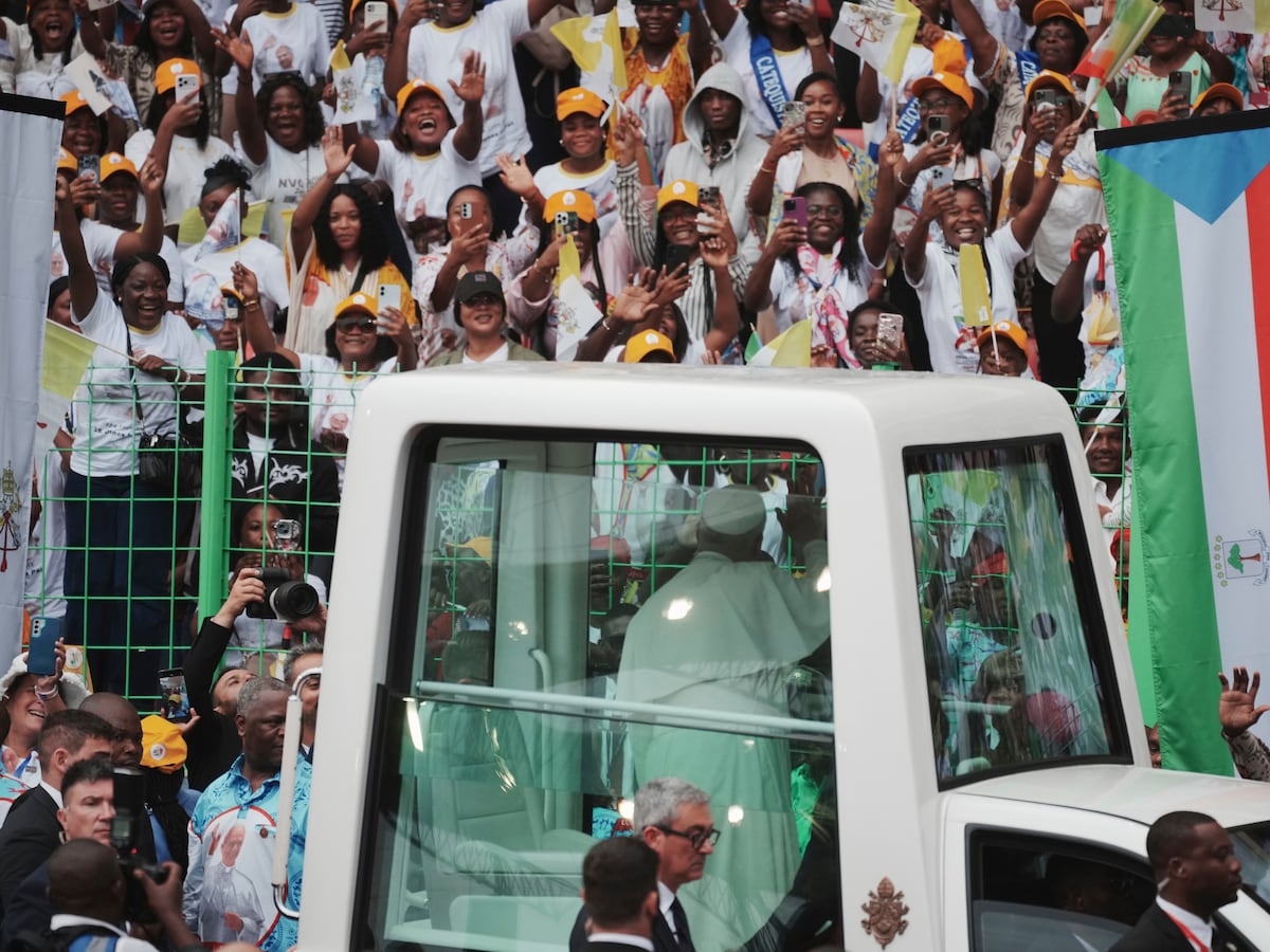 At Leo’s final Mass on Thursday, Michaela Mecha and her sister, Encarnacion, arrived at the Malabo stadium in the downpour at 4 a.m. They were dressed from head to toe in pope-themed attire, complete with yellow umbrellas decorated with Leo’s face.