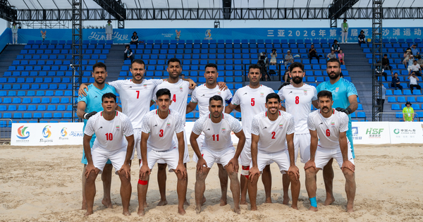 (260423) — SANYA, April 23, 2026 (Xinhua) — Players of Iran pose before the beach soccer men’s first round group B match between Iran and the United Arab Emirates at the 6th Asian Beach Games in Sanya, south China’s Hainan Province, April 23, 2026. (Xinhua/Hu Jingwen)