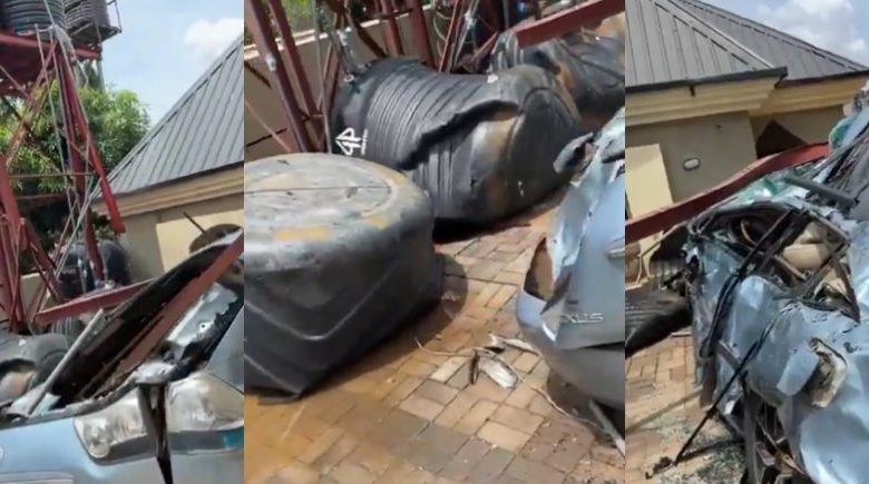 - A tenant’s Lexus car was crushed after a metal scaffolding holding water tanks collapsed in his compound, sparking safety concerns.